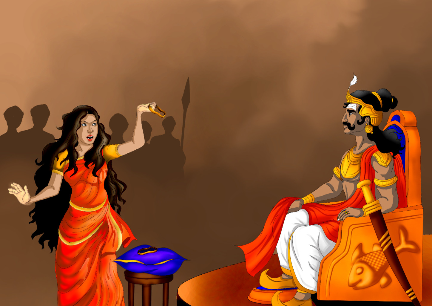 பாண்டிய மன்னன் நெடுஞ்செழியன் முன் கண்ணகி சிலம்பை உடைக்க முயலும் காட்சி.